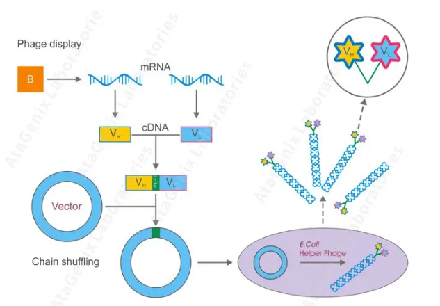 Phage library building refers to the H chain and L chain gene library of antibodies amplified from B lymphocytes, and the antibody fragment group is fused with phage capsid protein and displayed on the phage surface to form a phage display antibody library[1]. There are three main types: the scFv library (composed of VH and VL and joined by a small peptide (Gly4Ser) 3 into a single-stranded polypeptide), the Fab library (containing VH-CH, VL-Cl and joined together by disulfide bonds), and the VHH library (only heavy chain variable regions).